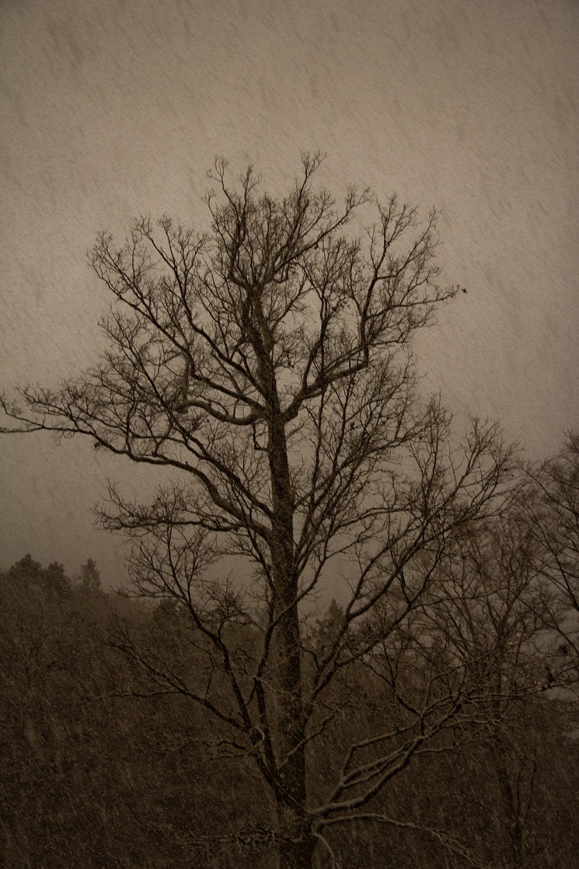 Finsterer Baum bei Schneefall