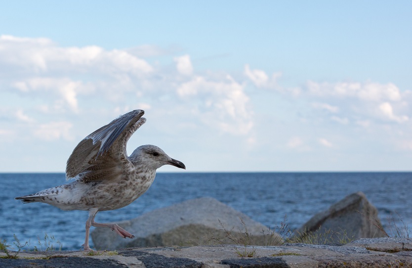 Möwe auf der Molenmauer im Sassnitzer Hafen.